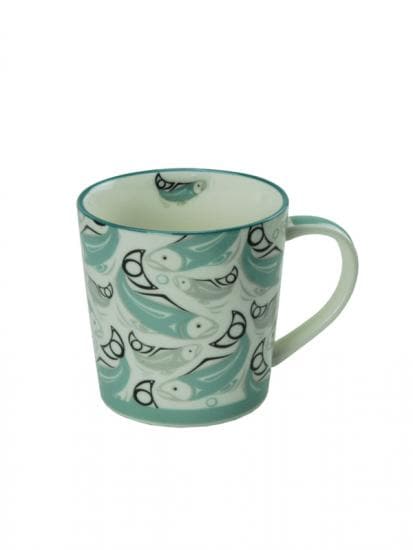 Boxed Porcelain Mug with Salmon design by artist Connie Dickens. Turquoise.