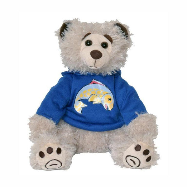 Meet Mokey the Spirit Bear, the cutest cuddle buddy around for children & adults alike! Measuring 9.5 inches, sitting, he is a quirky, new style teddy with a lot of funky personality. Fluffy cream fur & dressed in a stylish blue hoodie with a native design salmon.